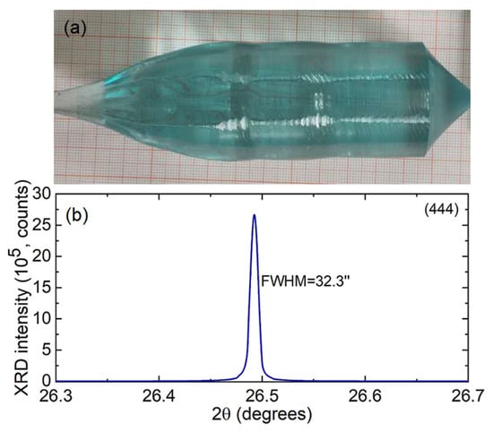The quality of the single crystal was evaluated by measuring the X-ray rocking curve using a high-resolution diffractometer (Bruker D8 DISCOVER) with CuKα1 radiation (λ = 1.5406 Å), as depicted in Figure 1b. This measurement was conducted around the (444) reflection, revealing a symmetric profile with a full width at half maximum of 32.3 arcsec. This indicates that the crystal possesses excellent quality and a high degree of crystallinity.