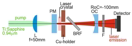 A continuous-wave Ti:sapphire laser (3900S, Spectra Physics) was utilized as the pump source, tuned to 941.0 nm and operating in the fundamental transverse mode (with beam quality factor M2 near to 1). The pump beam was directed into the laser crystal through the planar pump mirror (PM) using an uncoated spherical CaF2 lens with a focal length (f) of 50 mm, resulting in a pump spot size (2wP) of 34 ± 5 μm. The pumping occurred in a single pass, with the crystal absorbing approximately 97% of the pump radiation (excluding Fresnel losses). Any remaining pump radiation after passing through the output coupler (OC) was filtered out using a long-pass filter (FEL1000, Thorlabs, Newton, NJ, USA). The measured powers were adjusted to account for the transmission of this filter.