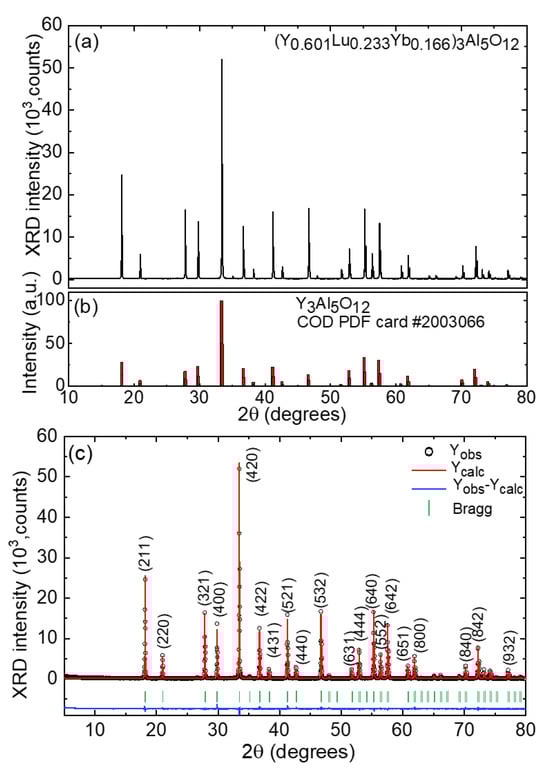 (a) Room-temperature X-ray powder diffraction (XRD) pattern of the (Y0.601Lu0.233Yb0.166)3Al5O12 crystal; (b) the reference pattern of Y3Al5O12 garnet (PDF card #2003066, COD database); (c) the Rietveld refinement plots (the observed, Yobs, calculated, Ycalc, and residual, Yobs-Ycalc, profiles); vertical dashes—Bragg reflections; numbers indicate the Miller’s indices (hkl).