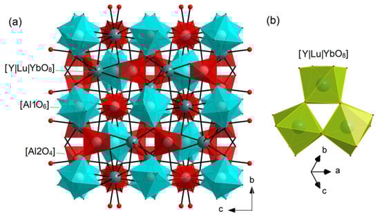 (a) A fragment of the crystal structure of Yb:(Y,Lu)AG garnet and projection on the b–c plane; (b) connection between the [Y|Lu|YbO8] polyhedra.