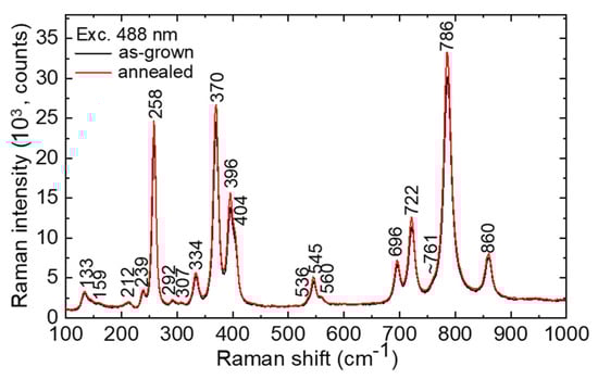 The unpolarized Raman spectra of the as-grown and annealed Yb:(Y,Lu)AG crystals are shown in Figure 6. There are 80 atoms inside the unit-cell of O10h cubic garnets. Following factor-group analysis, it leads to 97 lattice modes. At the center of the Brillouin zone (k = 0), the irreducible representations can be written as follows: Г = 3A1g + 8Eg +14F2g + 5A1u + 5A2u = 5A2g + 10Eu + 14F1g + 16F2u + 17F1u, among which 25 modes (A1g, Eg and F2g) are Raman-active []. In the spectra, 19 modes are observed. The most intense Raman band at 786 cm−1 (A1g) is assigned to the breathing mode of the [AlO4] tetrahedrons []. The maximum phonon energy of Yb:(Y,Lu)AG is 860 cm−1.
