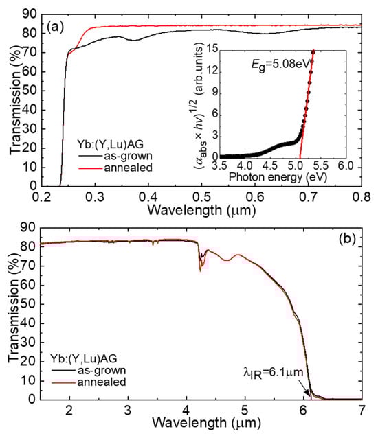 Transmission spectra of the as-grown and annealed Yb:(Y,Lu)AG crystals: (a) the spectral range of 0.2–0.8 μm; inset—Tauc plot for evaluating the optical bandgap Eg; (b) the spectral range of 1.5–7 μm. Sample thickness: t = 2.03 mm.