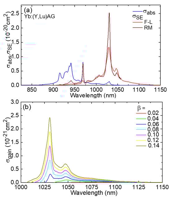 Transition cross-sections of Yb3+ ions (the 2F7/2 ⟷ 2F5/2 transition) in the Yb:(Y,Lu)AG crystal: (a) absorption, σabs, and stimulated-emission (SE), σSE, cross-sections; F-L: Füchtbauer–Ladenburg equation; RM: reciprocity method; (b) gain cross-sections, σgain = βσSE − (1 − β)σabs, β—inversion ratio.
