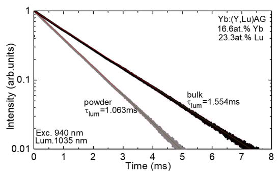 RT luminescence decay curve of Yb3+ ions in the annealed Yb:(Y,Lu)AG crystal (bulk and powdered crystalline samples); λexc = 940 nm; λlum = 1035 nm.