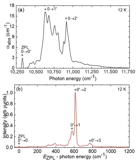 In Figure 10a,b, we present the absorption and luminescence spectra of Yb3+ ions in the (Y,Lu)AG crystal measured at a low temperature of 12K. The absorption spectrum is plotted against photon energy (hνph), while the emission spectrum is plotted against (EZPL − hνph) to facilitate the determination of the Stark sublevel energies within the Yb3+ multiplets. In the crystal field of (Y,Lu)AG, Yb3+ ions are anticipated to replace the host-forming Y3+|Lu3+ cations, occupying a specific site with D2 symmetry and VIII-fold coordination by oxygen. Within each 2S +1LJ multiplet of Yb3+ ions, the crystal field splits the states into J + 1/2 components, labeled as 0…3 for the ground state and 0′…2′ for the excited state. By analyzing the low-temperature spectra and excluding the phonon sidebands (as determined from the Raman spectrum), we can assign electronic transitions that occur between the Stark sublevels.