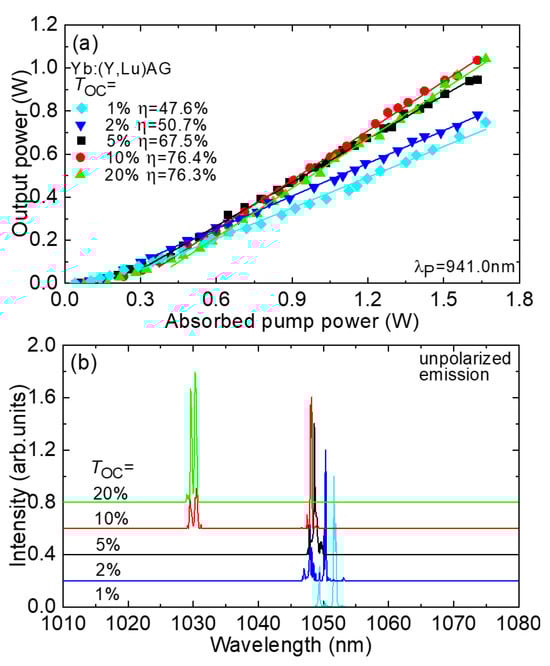 Free-running Yb:(Y,Lu)AG laser: (a) input–output dependences, η—slope efficiency; (b) typical spectra of laser emission (unpolarized radiation), λP = 941.0 nm.