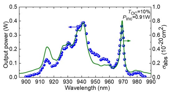 Laser excitation curve for the Yb:(Y,Lu)AG laser: blue circles—experimental data on the output power; green curve—absorption cross-section; σabs, spectrum; TOC = 10%; Pinc = 0.91 W.