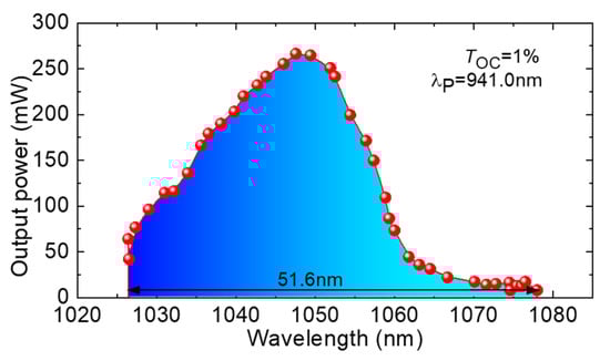 To investigate wavelength tunability, a birefringent plate was inserted into the laser cavity and oriented at Brewster’s angle. Employing a 1% output coupler (OC), we achieved continuous wavelength tuning across the range of 1026.4–1078.0 nm, corresponding to a tuning span of 51.6 nm at the zero-power level, as illustrated in Figure 13. The highest output power was achieved at approximately 1050 nm, aligning with the gain spectra for small β values and the characteristics of the free-running laser spectra.