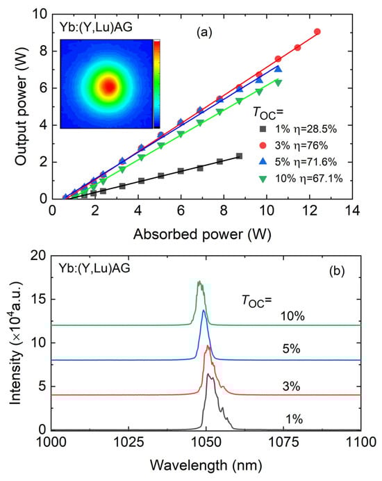 Continuous-wave Yb:(Y,Lu)AG microchip laser: (a) input–output dependences, η—slope efficiency; inset: 2D spatial intensity profile of the laser output from a CW Yb:(Y, Lu)AG laser measured at Pabs = 11.44 W; (b) typical laser emission spectra measured at Pabs = 5.98 W.