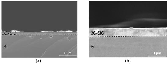 - Wischmeyer, F.; Wondrak, W.; Leidich, D.; Niemann, E. CVD growth of 3C-SiC on SOI (100) substrates with optimized interface structure. Mater. Sci. Eng. B 1999, 61–62, 563–566. [Google Scholar] [CrossRef]