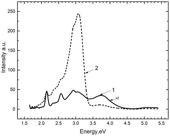 The phosphor was irradiated at 300 K with photons with an energy of 6.2 eV (Figure 1, curve 1). From Figure 1, it is clear that intracenter emissions from the impurity are observed at 2.16 eV and 2.56 eV, corresponding to the 4f-4f electronic transitions of rare earth ions in . In the next stage, the phosphor was irradiated with photons with an energy of 6.2 eV at 80 K (curve 2). After irradiation, the intensity of intracenter emission decreased significantly, and new emission bands appeared at 2.95 eV, 3.1 eV, 2.6–2.7 eV, 2.40 eV, and 3.7–3.8 eV (curve 2). The nature of the short-wavelength emission band 3.7–3.8 eV has previously been investigated. The band appears when an electron recombines with a localized hole .