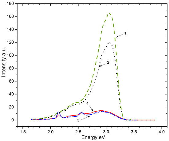 By irradiation with photons with an energy of 6.2 eV for 10–20 min, electron–hole trapping centers were created in the crystal at 80 K (Figure 3), which create recombination emissions of 2.95 eV and 3.1 eV. Then, the (Figure 3) crystal with induced defects was selectively excited by the photons with energies of 3.9–4.0 eV (curves 1 and 3) and 4.5–4.6 eV (curves 2 and 4) at 80 K and 300 K, respectively. The emission spectrum was measured in the spectral range from 1.5 eV to 3.8 eV. Figure 3 shows the emission spectrum of the phosphor with induced defects or electron–hole trapping centers when excited by photons with an energy of 3.9–4.0 eV (curves 1 and 3) or 4.5–4.6 eV (curves 4 and 2) at 80 K and 300 K. The figure shows that at 80 K intense recombination emissions appear at 3.1 eV and 2.95 eV (curves 1 and 2). The experimental results indicate that recombination emission is indeed excited at photon energies of 3.9–4.0 eV and 4.5–4.6 eV. This means that between the ground and excited local state of emissions at 3.1 eV and 2.95 eV, there are corresponding energies of 3.9–4.0 eV and 4.5–4.6 eV. From Figure 3, it is clear that at 300 K, the photon energies of 4.5–4.6 eV and 3.9–4.0 eV and impurity emissions for of 2.16 eV and 2.56 eV are excited (curves 1 and 4, Figure 3). This phenomenon is reflected in the following experiment (Figure 4).