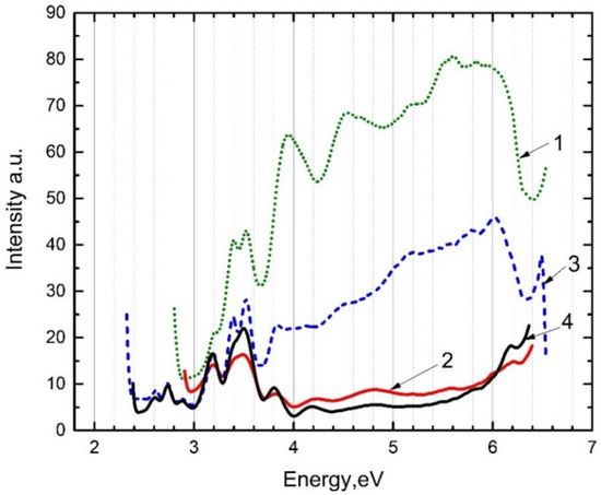 In the pre-irradiated with induced electron–hole trapping centers at 80 K and 300 K, we measured (Figure 4) the excitation spectrum of the impurity emission at 2.56 eV (curves 1 and 2) and 2.16 eV (curves 3 and 4). The spectral position of the emissions for which is shown above (2.56 eV and 2.16 eV), is described in a review by Lakshmanan, A. R. [23]. It can be seen from the figure that the impurity emission at 2.56 eV and 2.16 eV is excited at 3.2 eV and 3.40–3.52 eV, corresponding to the impurity intracenter excitation of the ion, as well as at 3.9–4.0 eV and 4.5–4.6 eV, corresponding to the excitation of long-wavelength recombination emission at 3.1 eV and 2.95 eV. These emissions are also excited close to fundamental regions of the matrix, 5.0 eV and 5.5–6.2 eV. The excitation of the ion in intracenter absorption in the matrix, as well as close to the fundamental region of the crystal, was already known [23].