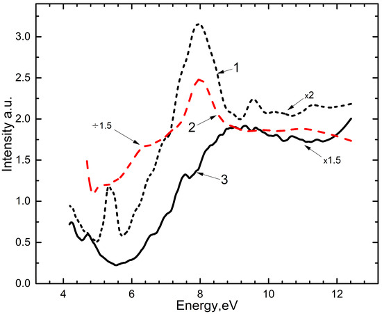 As a result of the recombination of an electron with a hole trapped by the ground state of the 3+ impurity, the fraction of the radiative state – in the combined radiative state decreases. The energy released during recombination process is transferred to the 3+ impurities. The process of energy transfer to the impurities occurs in this way. It seems to us that the emission arising as TSL, from which the absorbed dose is estimated, is associated with the annealing of accumulated holes localized near the impurities. We discussed one of the possible channels for the emergence of combined electronic radiative states. There is also another channel for the formation of a combined radiative electronic state. When they are irradiated with high-energy photons with an energy exceeding the band gap, free electron–hole pairs appear. When free electrons are trapped by impurities and anion complexes, impurity and intrinsic electron trapping centers arise, correlated with localized holes near the impurities. Both the processes of the formation of a combined radiative electronic state occur contemporaneously. At low photon energies, starting from 4–5 eV, combined radiative states are formed during the excitation of anionic complexes as a result of the charge transfer to the impurities and anionic radicals . This can be seen from Figure 5 (curve 3). The formation of a combined radiative electronic state at 2.95–3.1 eV occurs with an increasing intensity in the energy range from 6 eV to 8.4–9 eV (Figure 5).