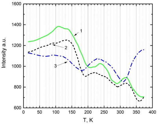 Figure 6 shows the temperature dependence of the intensity of recombination emissions (excited by 6.2 eV) of 2.95 eV and 3.1 eV and intracenter impurity emission of 2.16 eV from 15 K to 380 K. From Figure 6, the intensities of the emissions at 2.95 eV (curve 2) and 3.1 eV (curve 1) decrease in the temperature range of 150–200 K. Then, a slight increase is observed at 220–250 K and 300–370 K, and a decrease to a minimum value was observed. The intensity of impurity emission at 2.16 eV (curve 3) has a similar pattern of intensity decreasing to 190 K. After 210 K, there is a temperature-dependent release of energy from 220–280 K and above 330 K. The release of energies above 330 K is presumably associated with a similar band as in TSL (Figure 7), where there are similar temperature peaks in the region of 330–400 K.