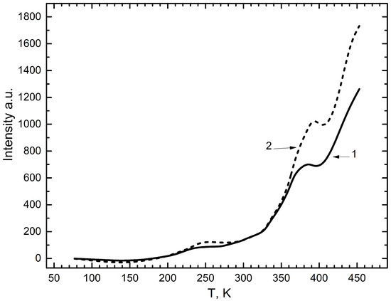 Figure 7 shows the curves of integral thermally stimulated luminescence (TSL) of the phosphor irradiated with X-ray radiation at 80 K. From the figure, it can be seen that that TSL peaks appear at 220–270 K, 330–400 K, and 420–450 K and higher. In the same figure, due to limitations with the experimental equipment, the 420–450 K bands are not clearly visible. The bands for TSL at these temperatures are known from the work of the authors [23] on the study of the thermo- and photoluminescence of .