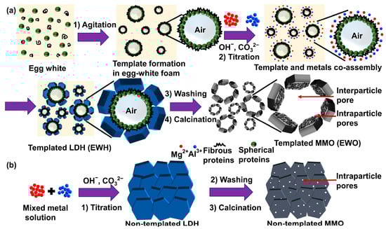 Herein, we suggest synthetic procedures for LDH and MMO with high porosity and specific surface area utilizing EW foam as a biogenic template, as illustrated in Figure 1. The egg-white-templated LDH was synthesized using the conventional coprecipitation method. The egg white proteins undergo unwinding and are surrounded by the air pockets after the agitation. The rapidly self-assembled proteins around the air pockets form a macromolecular network in the egg white foam, which acts as the sacrificial porogenic template for the synthesis. The conjoint self-assembly between the metal precursors and EW proteins results in a hierarchical architecture and facilitates the formation of the homogenous nanoporous structure by directly growing LDH on or around the proteins. As the proteins in EW foam develop large networks, we hypothesized that the protein moiety does not inhibit the crystal growth of LDH; rather, the protein network could act as the template to order the LDH particles. In other words, the air pockets covered by the protein arrays would remain as pores by arranging LDH particles around them. In this manner, the assembly of LDH layers would lose its preferred particle orientation along the crystallographic c-axis and obtain a large particle–particle space through the assembly of particles. Both EW-templated and non-templated LDH were prepared in this study, and their properties were compared in terms of crystal structure, textural morphology, and porosity, to elucidate the role of EW as a bio-template in the synthesis of LDH and MMO.
