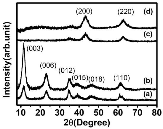 X-ray diffraction patterns of (a) EWH, (b) pristine LDH, (c) EWO, and (d) MMO.