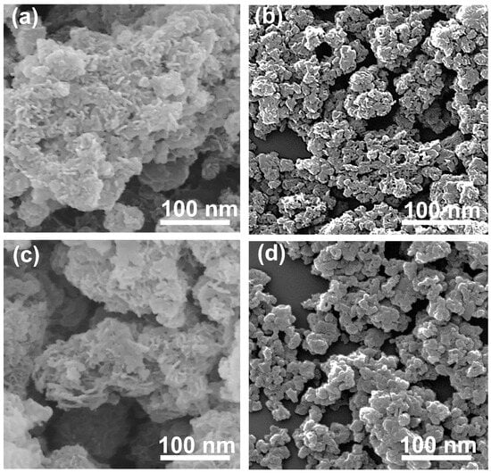 The morphology and arrangement of particles were investigated through scanning electron microscopy. The SEM images showed that the morphology of the EWH and EWO were fairly similar showing typical sand rose shapes (Figure 3a,c) []. The sand rose structure of the EWH and EWO can be attributed to the edge-to-face interaction among the LDH plate-like particles. The orientation of plate-like particles in both EWH and EWO suggested particle growth along the protein moiety in EW foam. The existence of protein in the EW foam not only hindered the particle agglomeration of LDH but also arranged the particles with proper interparticle space. In contrast, the SEM images of both LDH and MMO exhibited large lumps and were densely assembled, being hundreds of nanometers in size (Figure 3b,d). The particle size and morphology of the non-templated MMO were comparable with that of the pristine LDH formed by the conventional method, as shown in Figure 3b,d according to the previous report []. The non-templated LDH and its MMO show few interparticle pores due to the aggregation of LDH particles. It is generally known that LDH particles tend to get together through strong interparticle interaction. Although the particle sizes of the LDHs and MMOs were not precisely determined, both LDHs seemed to have comparable particle dimensions, of approximately 75 nm for the lateral size. Therefore, the different crystallinity between EWH and LDH observed in the XRD (Figure 2) was attributed to the different particle orientations, not to the crystallite size. The SEM images of the templated and non-templated MMOs also suggested that the particle morphologies of their corresponding pristine LDH are almost preserved after thermal treatment. As a result, the lattice structures of the EWH and LDH did not undergo a collapse of the metal hydroxide layers after dehydration.