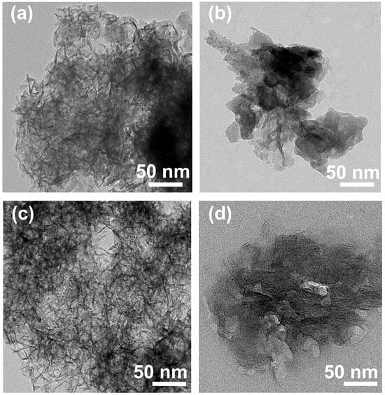 TEM images of (a) EWH, (b) LDH, (c) EWO, and (d) MMO.