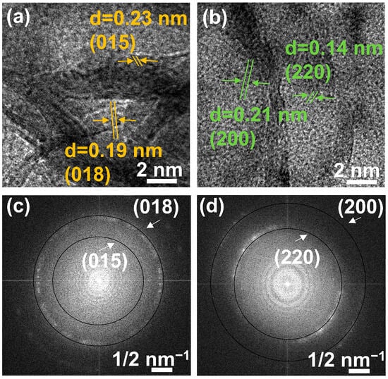 The orientation of the particles was also analyzed by a high-magnification image. The lattice fringe images of EWH and EWO are illustrated in Figure 5a,b, in which a set of white lines depicts the lattice fringes. The set of white lines indicated the random orientation of the particles toward the different directions. As shown in Figure 5a,b, both EWH and EWO revealed lattice fringes corresponding to the planes of (015) and (018) and (200) and (220), respectively. As a result, ring patterns can be observed in the fast Fourier transform (FFT) image of both EWH and EWO. The solid circular lines in Figure 5c,d attributed to the plane of (018) and (015) and (200) and (220) were observed in FFT patterns in both EWH and EWO, confirming the random arrangement of crystallites.
