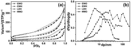 (a) N2 adsorption and desorption isotherms (closed symbol—adsorption, open symbol—desorption) and (b) BJH pore size distribution plots for EWO, EWH, LDH, and MMO.