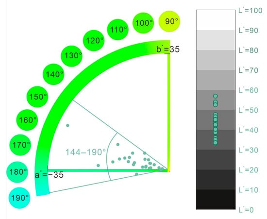 Color distribution of emerald samples in the CIELAB space. Modified from [20].