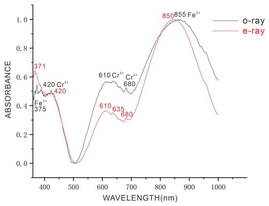 Polarized spectra of the oriented samples were collected for obtaining the ordinary ray (o-ray) and the extraordinary ray (e-ray). All the emeralds showed similar bands for both the o-ray and e-ray. The representative UV-Vis-NIR spectra of Kamakanga emerald (ZAKA-7) are shown in Figure 3.