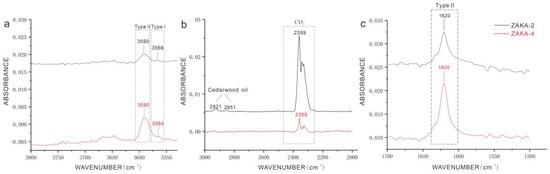 The representative infrared spectra (ZAKA-2 and ZAKA-4) in the range of (a) 3800–3500 cm−1, (b) 3000–2000 cm−1, and (c) 1700–1500 cm−1.