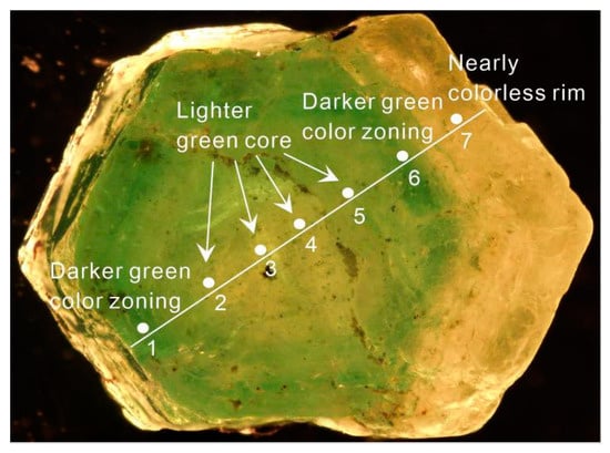 Representative photomicrograph of color zoning emerald ZAKA-3 with darker green color zoning, lighter green core, and nearly colorless rim. The white circles indicate the positions of analysis points corresponding to analyses of ZAKA-3-1 to ZAKA-3-7.