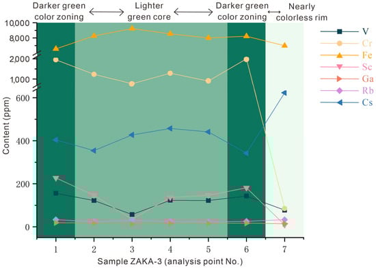 In addition, the variation of trace elements in different color zones of the color zoning sample (ZAKA-3) is shown in Figure 6. With the variation of colors (darker green color zoning → lighter green core → darker green color zoning → nearly colorless rim), the contents of Cr, V, and Sc showed large variability (Cr: 1954 → 767 → 2000 → 85 ppmw, Sc: 227 → 35 → 181 → 9 ppmw, V: 156 → 57 → 143 → 85 ppmw) (Figure 7). The trend was that the darker the green color, the higher the contents of Cr, Sc, and V, and the lower the content of Cs. However, the content of Cr was much higher than those of Sc, V, and Cs. In addition, Fe may have had a change in valence, so its content did not vary greatly with color. According to previous studies, the darker the green color, the higher the content of Fe [27]. Therefore, Cr is the main chromogenic element in Kamakanga emeralds, and Sc, V, Cs, and Fe may have some influence on the color of Kamakanga emeralds. Most trace-element contents were stable in the lighter green core and vary significantly in the darker green color zoning and nearly colorless rim. This indicated that Kamakanga emeralds were grown in a stable environment during the early stages of mineralization.