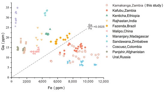 Plot of ferrum (Fe) versus gallium (Ga) concentrations from LA-ICP-MS analyses. Data are expressed in ppmw. Other sources are from [18,28,29,30,31,32,33,34].