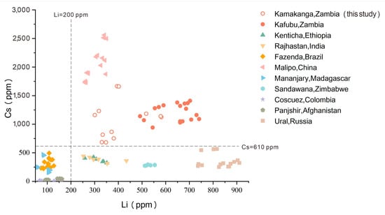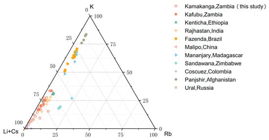 Although Zambia and Madagascar partially overlap in the Fe versus Ga binary diagram, the two sources can be easily distinguished by the Li versus Cs binary diagram (Figure 9). This is because the contents of Cs (avg. 266 ppmw) and Li (avg. 89 ppmw) in Madagascar are much lower than the contents of Cs (avg. 1331 ppmw) and Li (avg. 485 ppmw) in Zambia.