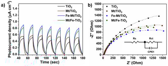 The transient photocurrent responses under chopped irradiation and EIS were further investigated to study the migration and generation of electron in all samples. As seen in Figure 4a, the photocurrent density exhibited a gradual increase in the order of Fe-Mt/TiO2 > Mt/Fe-TiO2 > Mt/TiO2 > pure TiO2. This indicates improved charge migration in the composite materials compared to pure TiO2 and enhanced charge transfer in Fe-Mt/TiO2 compared to Mt/Fe-TiO2. In addition, in EIS Nyquist diagrams (Figure 4b), the Mt-based composites displayed a smaller arc radius than pure TiO2, which suggested a lower charge transfer resistance (Table S2) than that of pure TiO2. Similarly, the Fe-Mt/TiO2 has a smaller arc radius than that of Mt/Fe-TiO2, indicating that the Fe-Mt/TiO2 has weaker resistance for charge transportation than Mt/Fe-TiO2 [26].