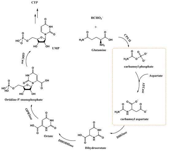 - Evans, D.R.; Guy, H.I. Mammalian pyrimidine biosynthesis: Fresh insights into an ancient pathway. J. Biol. Chem. 2004, 279, 33035–33038. [Google Scholar] [CrossRef]