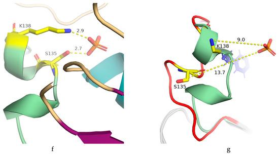 Each subunit within the trimeric structure of PfATCase possesses the same fold that contains 11 α-helixes and 9 β-strands [56] and can broadly be divided into a carbamoyl phosphate (CP) and L-aspartate (Asp) binding domain, located at the N-terminal and C-termini of the chain, respectively. Both overall structure and catalytic subunit of PfATCase demonstrated a high degree of conservation with the well-known E. coil ATCase, which serves as a textbook example of ATCase [55,57]. This conservation encompasses not only the sequence but also the secondary structural elements. Furthermore, the active site residues in PfATCase, such as Ser135 and Lys138 (Figure 2c), align perfectly with the corresponding residues in E. coil ATCase, which are known to be an essential part of the catalytic activity of ATCase [55].