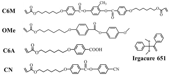 Materials: The materials used in this study include negative LC mixtures, photopolymerizable LC monomers, and photoinitiator IR 651. The negative LC mixtures were purchased from Yantai Xianhua Chem-Tech. Co., Ltd., Yantai, China—product code is GXV-7822-180, with a melting point of 233.15 K, clearing point of 380.15 K, permittivity Δε of −4.4, ne of 1.684, and Δn of 0.180. Cyano monoacrylate monomer CN, methoxy monoacrylate monomer Ome, carboxyl monoacrylate monomer C6A, and diacrylate C6M used in this research were purchased from Jiangsu Hecheng Advanced Material Co., Ltd., Nanjing, China. IR 651 was purchased from Bide Pharmatech Ltd., Shanghai, China. For the purpose of obtaining different polymer network structures, the network concentration was set at 7.5 wt%, and the corresponding concentration of negative LC GXV-7822-180 was 92.4 wt%. The concentration of photoinitiator remained at 0.1 wt% with no change. The composition ratios of different samples are listed in Table 1. The molecular structures of C6M, Ome, C6A, CN, and IR 651 are demonstrated in Figure 1.