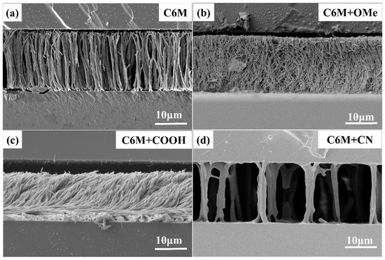 Under the same reaction conditions with monoacrylic monomer content remaining at 3.0 wt%, the influence exerted on polymer networks from LC monoacrylates with different functional groups can be observed in Figure 2. The cyano polymer network in Figure 2d was much sparser than that of other PSLC networks in Figure 2a–c, meaning a key role in reducing density on PSLC polymer networks was played by cyano monoacrylate monomers. The polymer network direction of methoxy monoacrylate was much more messy than the other three, which meant during the polymerization process, methoxy monoacrylate polymerized in a random direction, which was unfavorable to the uniform alignment of liquid crystals.