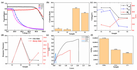 Electro-optical performance curves of PSLC devices with different functional groups. (a) Voltage–transmittance curves of PSLC devices with different functional groups; (b) contrast ratio curves of PSLC devices with different functional groups; (c) threshold voltages, saturation voltages, and the difference between them of PSLC devices with different functional groups; (d) rise times and decay times of PSLC devices with different functional groups; (e) stress–strain curves of PSLC devices with different functional groups; (f) peel strength curves of PSLC devices with different functional groups.
