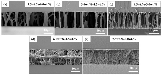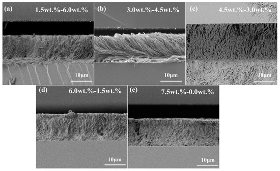 SEM micrographs of carboxyl PSLC devices with a polymer concentration of 7.5% from a cross-sectional view. The scales of all micrographs are 10 μm. (a) Sample B2−2; (b) Sample C2−2; (c) Sample D2−2; (d) Sample E2−2; and (e) Sample F2−2, the concentration of carboxyl monoacrylate increases from 1.5 wt% to 7.5 wt%, while that of diacrylate decreases from 6.0 wt% to 0.0 wt%. The ratios of monoacrylate monomer to diacrylate monomer are 1.5:6.0, 3.0:4.5, 3.5:4.0, 6.0:1.5, and 7.5:0, respectively.