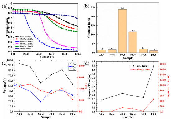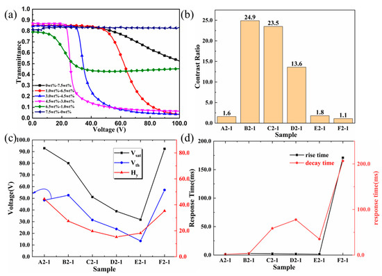 Electro-optical performance curves of samples with different ratios of carboxyl monoacrylate monomers and diacrylate monomers. (a) Voltage–transmittance curves from Sample A2−2 to Sample F2−2; (b) contrast ratios from Sample A2−2 to Sample F2−2; (c) threshold voltages, saturation voltages, and the difference between them from Sample A2−2 to Sample F2−2; (d) rise times and decay times from Sample A2−2 to Sample F2−2.