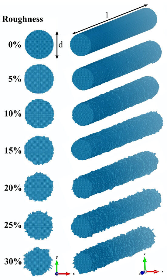 The iron nanowire was simulated using bcc crystal structure with a unit cell size of 2.866 Å. In order to introduce a surface roughness the following procedure was applied. First, the cylinder volume was divided into 50 equal cylindrical segments of 2 nm height each, making circular perpendicular cross-sections at every portion of the long axis. Then, for each slice the radius was changed by from its unperturbed value r. The radius variation was effectuated every 5 deg of circumference with the use of a random number generator with a Gaussian distribution. The width of the Gaussian function, i.e., the standard error describes the depth of the roughness. In what follows we report the results as functions of the percentage of the radius , where is the standard deviation of the normal distribution. The approach adopted for the surface roughness implementation in the iron nanowires in the present paper is schematically represented in the Figure 1. Such a method provides a unique surface roughness of each nanowire and can approximate the structure of real materials. In our calculations, six different amplitudes of roughness (5%, 10%, 15%, 20%, 25%, 30%) were applied as depicted in Figure 2. The software Vampire allows one to compute the equilibrium configuration of atomic spins in the whole volume of the so design sample at every strength and direction of the applied magnetic field. The computation of the net magnetization at every value of the magnetic field allowed us to obtain hysteresis loops for every model sample. In addition, the total energy of the system for each roughness amplitude was calculated as a function of external magnetic field.