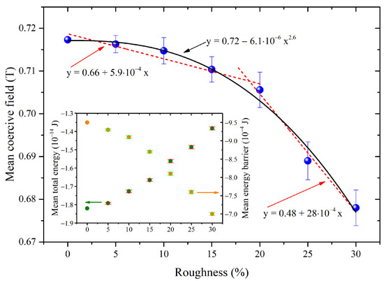 Change of the mean coercive field with the surface roughness increase (inset: change of the total energy and energy barrier with roughness). Dashed lines represent fitting to the linear function and solid line represents fitting to the non-integer exponent. Error bars show the standard deviation of the distribution of the values.