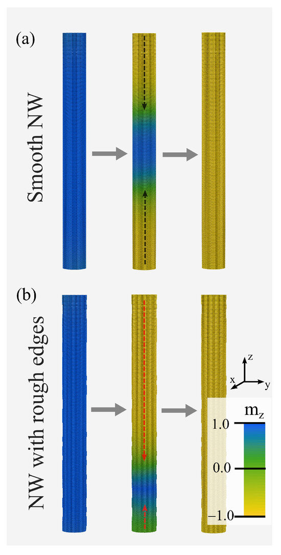 Spin magnetic configuration of NW during remagnetization process for the case of smooth nanowire (a) and NW with rough edges (b). The color changes with the spin projection as shown in the inserted bar. The boundary cases correspond to pure blue and pure yellow colors for the spins aligned up and down, along the NW axis.