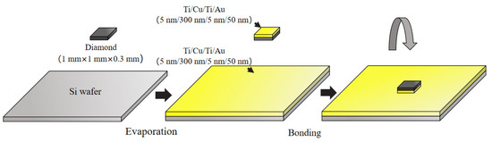- Matsumae, T.; Kurashima, Y.; Umezawa, H.; Mokuno, Y.; Takagi, H. Room-temperature bonding of single-crystal diamond and Si using Au/Au atomic diffusion bonding in atmospheric air. Microelectron. Eng. 2018, 195, 68–73. [Google Scholar] [CrossRef]