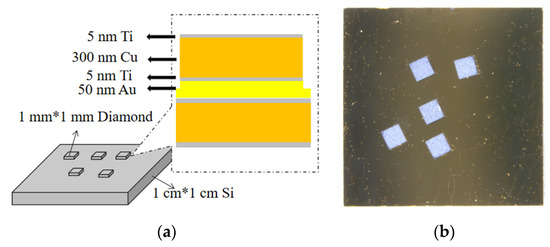 As chip integration continues to advance, the power density of microelectronic devices steadily increases, leading to a sharp rise in the internal temperature of the chips [1,2]. However, the traditional solder materials used in these devices exhibit insufficient thermal conductivity, preventing the chips from efficiently dissipating heat and resulting in potential thermal reliability issues. Hence, there is an urgent need to adopt high-thermal-conductivity materials and reliable bonding techniques to mitigate the adverse effects of temperature on microelectronic devices. Diamond heat spreaders have become one of the preferred materials for advanced packaging thermal management due to their outstanding thermal conductivity, extremely low coefficient of thermal expansion, and excellent mechanical properties [3]. However, due to the inherent structural stability and significant chemical inertness of diamond, it is challenging to establish a strong interface bond with semiconductor substrates, limiting the full play of diamond’s high thermal conductivity capabilities [4].