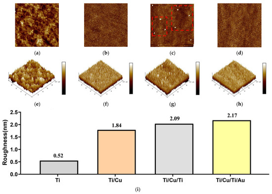 The AFM measurement results and surface roughness analysis (i) of Si-Ti (a,e), Si-Ti/Cu (b,f), Si-Ti/Cu/Ti (c,g), and Si-Ti/Cu/Ti/Au (d,h).