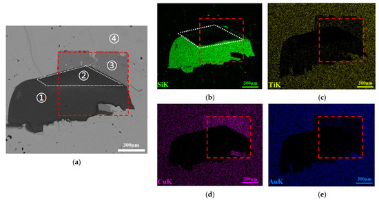 The bonding strength of Si-Ti/Cu/Ti/Au-D was evaluated using a tensile shear force tester. The strength test results (Figure 7) indicate that as the bonding pressure increases, the bonding strength also increases. When the bonding pressure reaches 6 MPa, the bonding strength reaches 48.51 MPa. Upon reaching the shear force fracture threshold, the diamond layer is detached. Figure 8a, Figure 8b, Figure 8c, and Figure 8d represent the fracture surface morphology for bonding pressures of 1, 3, 5, and 6 Mpa, respectively. In these images, the bright regions correspond to the fractured silicon substrate, with the fracture extending beyond the bonding area. It is worth noting that the thin film coatings at the bonding interface also underwent delamination. To delve further into the interface fracture mechanism, SEM observations of the cross-sectional morphology of the Si-Ti/Cu/Ti/Au-D sample bonded at 6 Mpa were conducted. Additionally, EDS analysis of element distribution was performed, as shown in Figure 9 (the red box highlights the bonding area). In Figure 9a, the elements in regions marked as ① and ② are primarily Si, which is the main component of the fracture surface. No other elements are detected in this region, indicating that the Si layer experiences brittle fracture under shear force. This also confirms that the bonding layer strength is greater than that of the substrate. In Figure 9b, the region corresponding to ② in Figure 9a appears black because the interface fracture is deeper, resulting in weaker signals produced by the interaction between the electron beam and the sample, which is difficult to detect. However, considering the overall analysis of the distribution of other elements, it can be concluded that Si is present in this region. In Figure 9a, the region labeled as ③ is primarily composed of Cu (Figure 9d) with a small amount of Ti (Figure 9c), indicating that, in addition to Si fracture, the Ti in the Ti/Cu interface also detaches under the action of shear force. The region ④ in Figure 9a is the non-bonding area, and its composition includes Ti (Figure 9c), Cu (Figure 9d), and Au (Figure 9e). The above analysis results show that the Ti and Cu surface diffused through the Au layer to the non-bonding interface, and Au was the element present at the bonding interface.