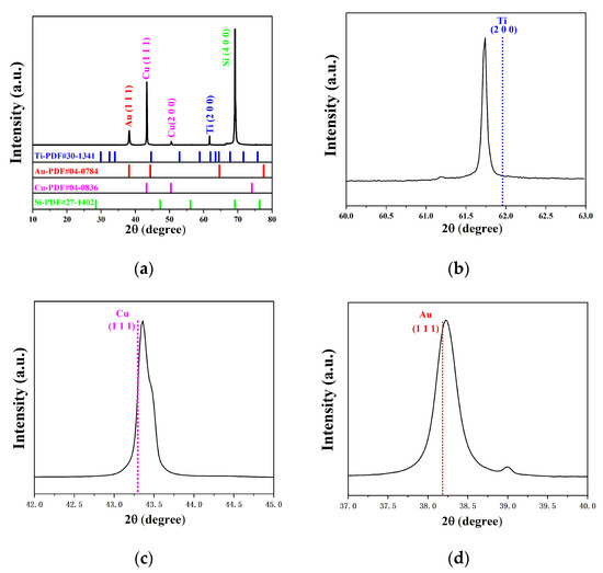 The XRD pattern of the Si-Ti/Cu/Ti/Au-D (a), Ti offset (b), Cu offset (c), and Au offset (d).