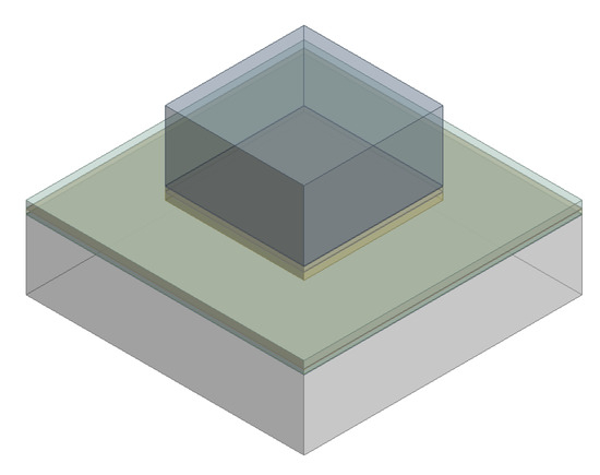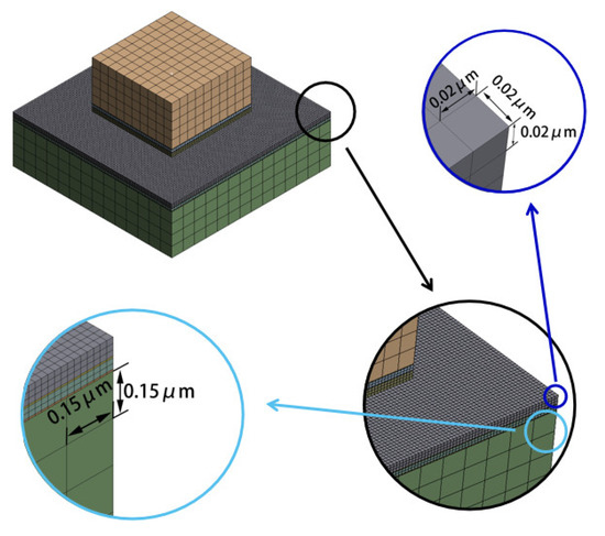 Based on the nominal stress method [29], the coupled thermal–mechanical analysis was conducted using ANSYS Mechanical finite element software, along with the nCode DesignLife fatigue analysis module, to elucidate the mechanical performance and potential failure points of the Si-Ti/Cu/Ti/Au-D structure. Figure 11 represents the simulation model, and the material properties of each layer are listed in Table 2. Due to significant differences in structural dimensions, the simulation model is simplified. As shown in Figure 12, the refined meshes are applied to the metal layers (divided into 0.02 × 0.02 × 0.02 µm3), while standard mesh divisions are used for the silicon substrate and diamond (divided into 0.15 × 0.15 × 0.15 µm3). Contact bonding is established between the various components.